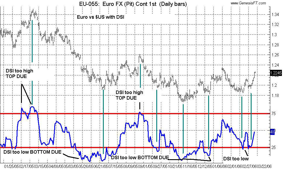 This chart shows the DSI plotted against the Euro. I have marked areas where the DSI was at an extreme high or low. Note the close correlation between DSI tops and bottoms and price tops and bottoms. Note also that DSI is a LEADING indicator - it tends to precede price tops and bottoms. Furthermore, DSI can be combined with traditional indicators as a confirming tool.