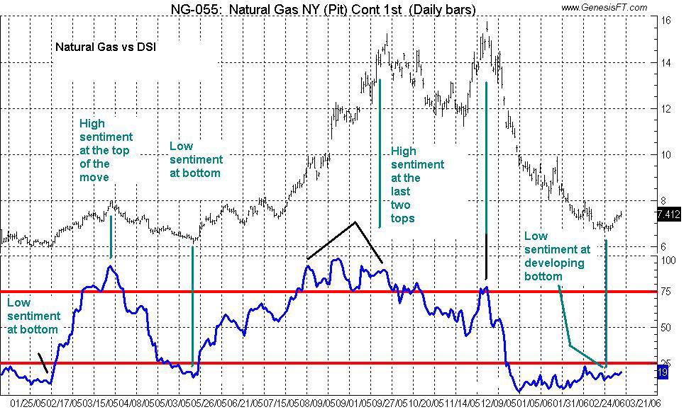 This chart shows Natural Gas futures plotted against daily DSI. As you can see, the highs and lows in DSI at EXTREMES correlate closely with tops and bottoms in price. Here also note that the DSI tends to precede tops and bottoms and it is, therefore, an effective leading indicator.
