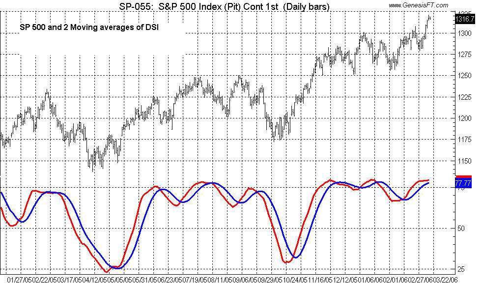 This chart shows an entirely different application if DSI. I've run a moving average of the DSI (red line) with a moving average of the moving average (blue line). Short term buy and sell signals are indicated when the lines cross. By adding trailing stops and effective risk management, the DSI can be used more systematically as its own confirming indicator.