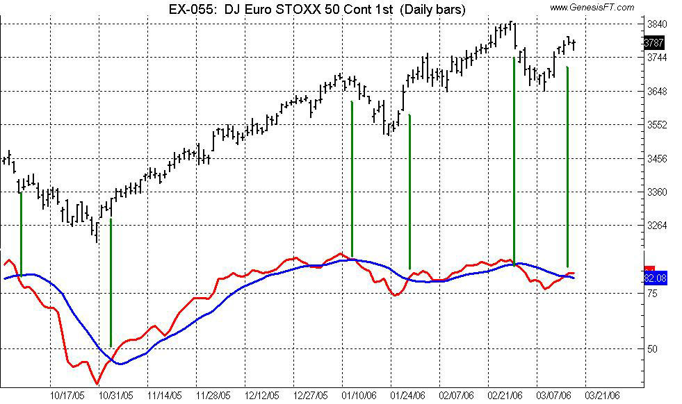 This chart shows the EuroStoxx 50 vs two moving averages of DSI. Signals occur at the moving average crossovers.